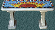 - a beautifully hand crafted cement bench with rising sun pattern created out of ceramic tiles. A beautiful piece that adds color to any outdoor environment.